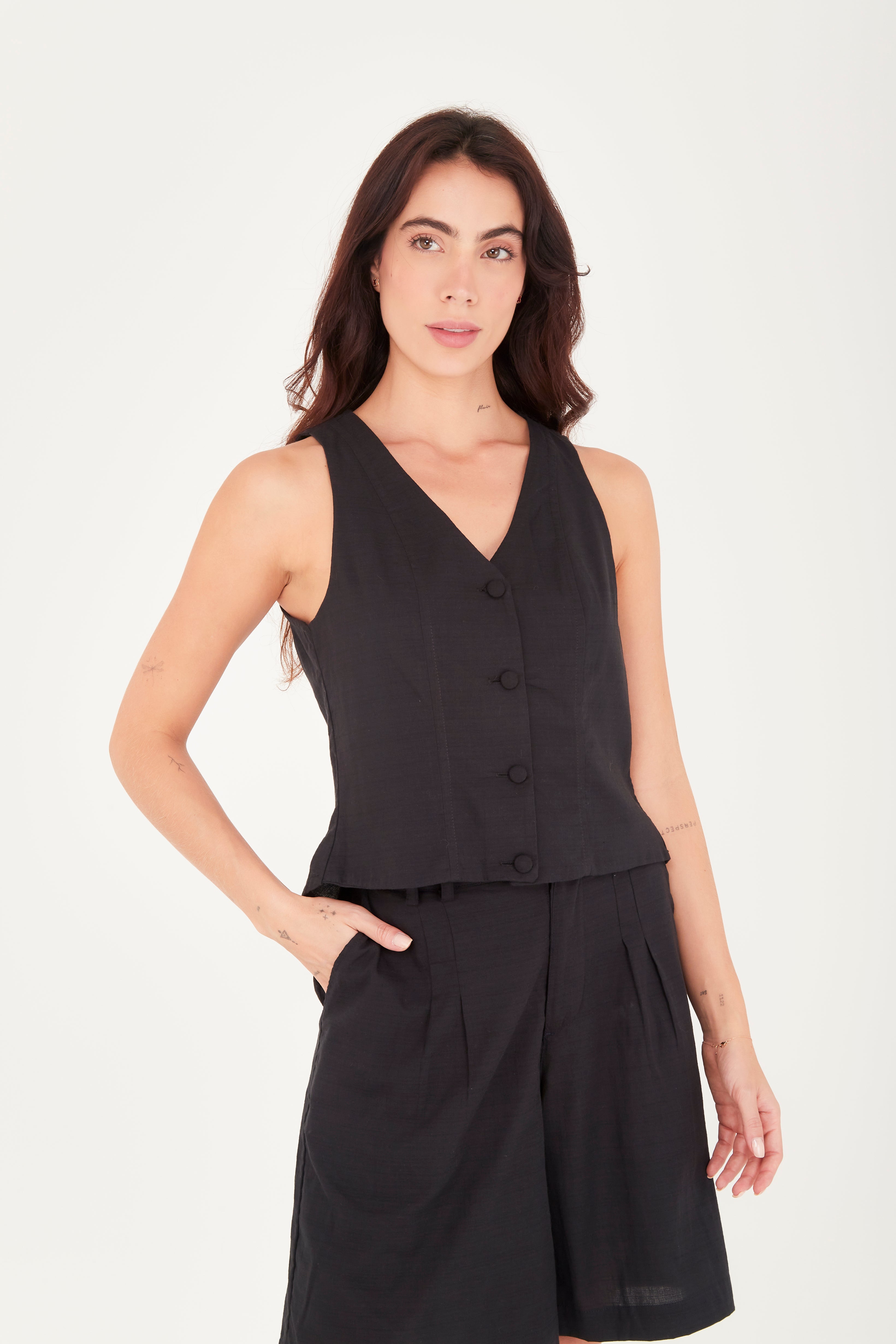 Este chaleco Taina Marfil presenta una silueta semi ajustada que realza la figura con elegancia. Su escote en V, complementado con una perilla de botones, aporta un toque clásico y sofisticado. La espalda cruzada con abertura no solo añade un detalle distintivo, sino que también mejora la comodidad y libertad de movimiento, ideal para quienes buscan estilo y funcionalidad en una sola prenda.